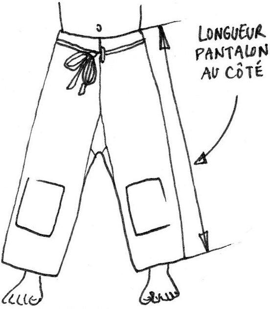 – le pantalon qui se noue à la taille par un système de cordon coulissant qui permet au pratiquant de l’ajuster sur lui en tirant sur les côtés.