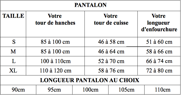 Le tableau des tailles peut vous permettre de déterminer également quelle taille correspond le mieux par rapport au tour de cuisse et à la longueur d’enfourchure.