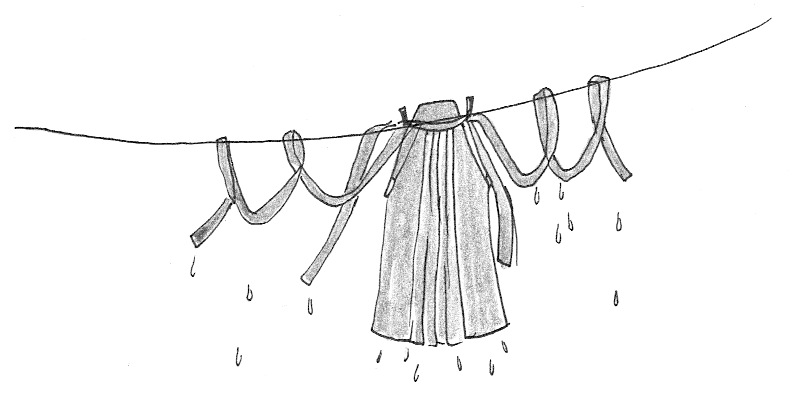 Suspendre le hakama à un cintre par la taille: en le faisant sécher ainsi en position verticale, le poids du vêtement et le ruissellement de l’eau permettent aux plis de garder leur aplomb.